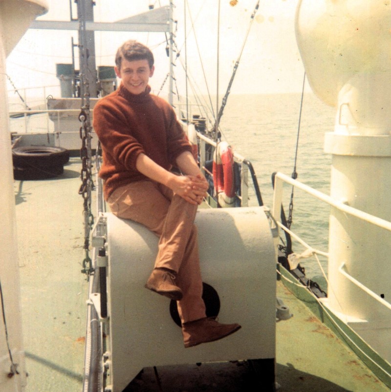 ![]() Tender day. Ian MacRae (white shirt), Tom Edwards (chequered jacket), Roger Day (red collar) and Kerry Clarke (foreground) on deck. |