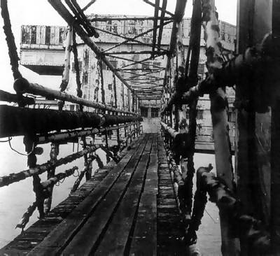 Being winched aboard Shivering Sands. Susan says Reg designed this contraption because it was too dangerous to tie a boat to the leg of the tower when the sea was rough. |