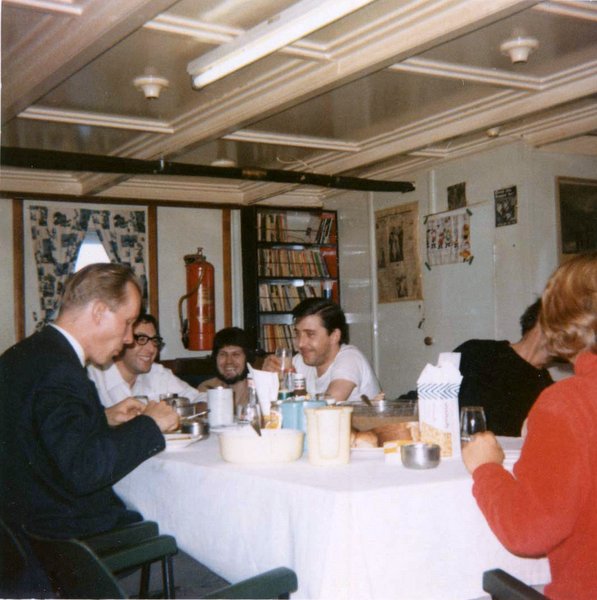Dave Lee Travis, Don Allen, Jerry Leighton and others enjoying a meal. Nick can't remember who the lady was. It