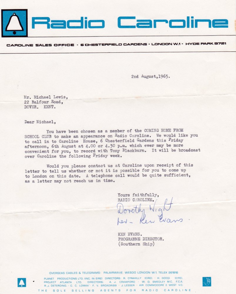 A letter inviting Mike to feature on Tony Blackburn's show on Radio Caroline South. Click to enlarge. |
