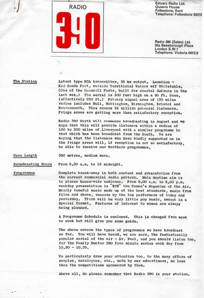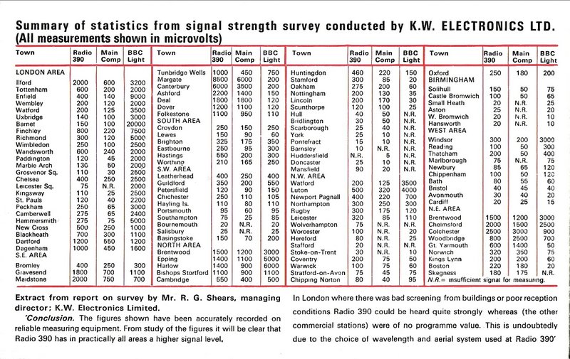The rate card above mentions Radio 390's strong signal and the survey carried out to measure its strength around the country. This leaflet gives the details. |