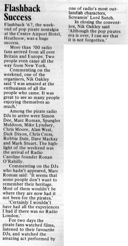 Flashback '67, the first ever offshore radio convention, took place at The Centre Airport Hotel near London's Heathrow Airport over the weekend of 13th and 14th August 1977, ten years after the