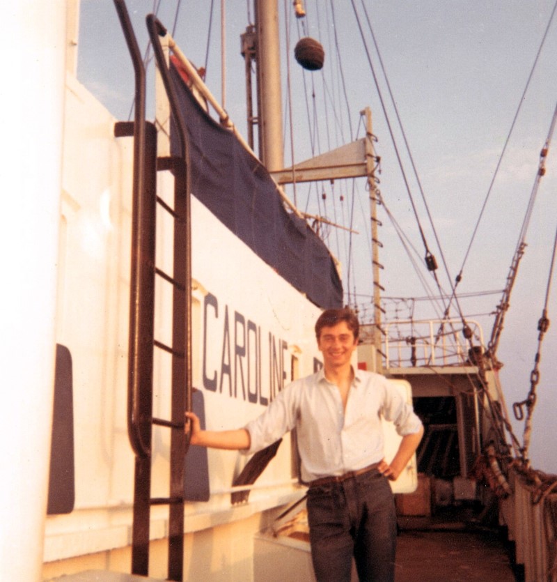 ![]() Tender day. Ian MacRae (white shirt), Tom Edwards (chequered jacket), Roger Day (red collar) and Kerry Clarke (foreground) on deck. |