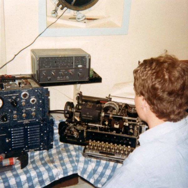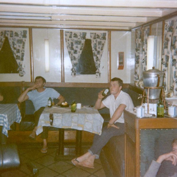 Left to right: Dave Lee Travis, Mike Wright, Jerry Leighton with Manfred Sommer (standing) and crew-members in the mess. |